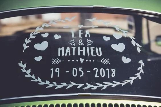 Pour une solution de facilité, on n’aura pas mieux ! On les colle sur les vitres de la voiture et c’est fini ! Très pratiques à installer, ils sont d’une grande modernité et il en existe aussi bien en français qu’en anglais pour donner le ton du jour. Pour une décoration discrète, ils seront également adaptés et ne risqueront pas de s’abimer au cours du trajet.