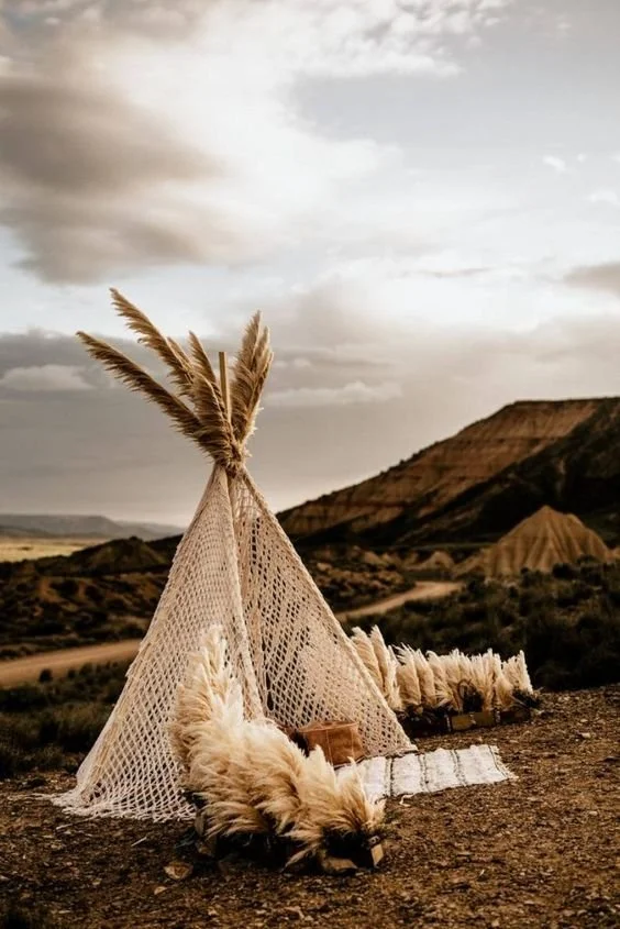 Impossible que vous soyez passé à côté du macramé : c’est LA tendance de 2020-2021… Comme tout ce qui est dans l’ambiance bohème d’ailleurs. C’est LA tendance de l’année, comme tout ce qui est ambiance bohème d’ailleurs ! La structure en macramé est la bonne idée déco pour remplacer la traditionnelle arche de cérémonie. En plus, elle est très économique si vous la faites vous-même (attention, niveau budget mais pas niveau temps… ça peut être très long) puisque vous n’aurez besoin que de cordons. Plus qu’à choisir les motifs et de l’agrémenter selon vos envies !